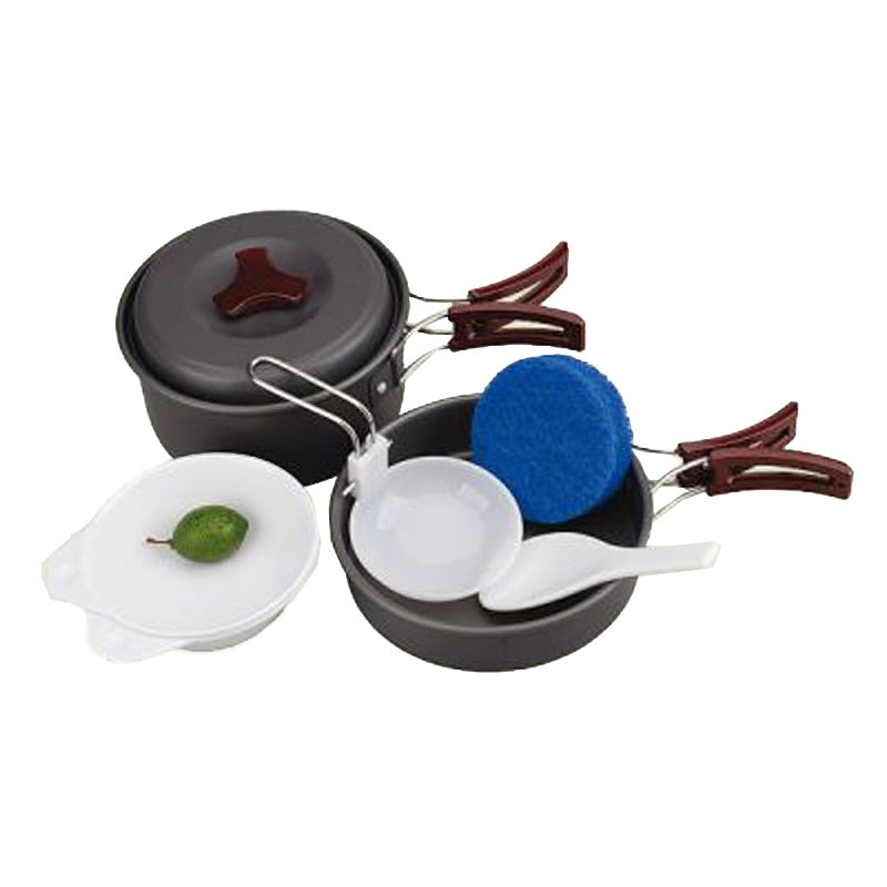 Includes: 1 Pot with Lid (15cm, 750ml), 1 Pan (15.5cm), 1 Foldable Ladle, 1 Melamine Spoon, 2 Melamine Bowl, 1 Mesh bag